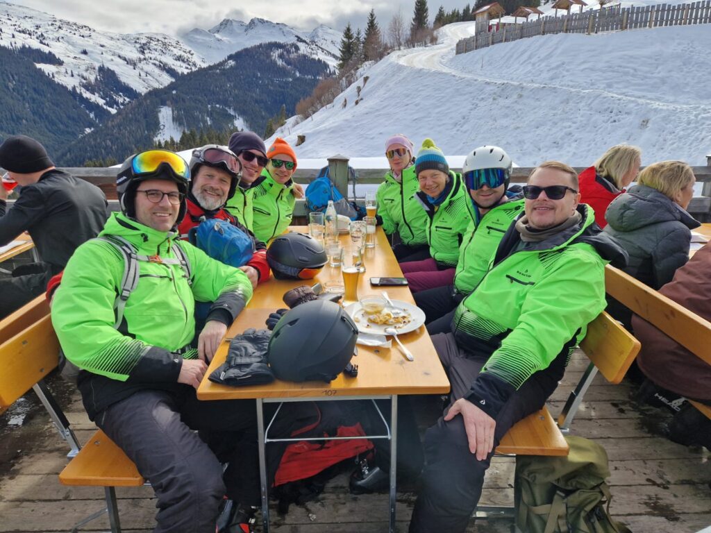 - Heute morgen sind wir gegen 7:00 Uhr aufgestanden. Dann gab es Frühstück um 7:30, das Frühstück ist immer sehr lecker. Danach haben wir uns das Lunchpaket für die Piste eingepackt. Um 8:25 Uhr sind wir mit dem Bus zur Piste gefahren, davor haben wir im Skikeller die Skischuhe geholt. An der Bushaltestelle angekommen sind wir zur Scheune gegangen, wo die Skier drin stehen, die haben wir dann angezogen und mit Frau Schikotanz am Anfängerhügel, sind wir uns warm gefahren. Nach 4 Runden warmfahren sind wir mit der Gruppe von Frau Schikotanz mit dem 12er Express hochgefahren und das Stückchen rote Piste runtergefahren. Nachdem wir runter gefahren sind, sind wir mit der 12er-Kogel-Lift bis ganz hoch auf den Gipfel gefahren. Von dort aus sind wir die blaue Piste runtergebrettert. Nach dem ersten Mal haben wir eine kleine Pause gemacht und die Rucksäcke abgestellt. Danach sind wir die gleiche Piste nochmal gefahren. Nun sind wir eine andere Piste mit einem anderen Lift gefahren. Nachdem wir da unten waren sind wir zu einer Alm gefahren und haben was leckeres gegessen und getrunken. Als alle fertig waren, sind wir noch einmal eine blaue Piste gefahren. Als wir da unten waren, habe ich eine kleine Pause gemacht mit Ben und Giuliano, weil mein Knie wehgetan hat. Dann sind wir drei mit Herrn Knapp runter zum Anfängerhügel gefahren. Dort sind wir noch einige Runden mit dem Tellerlift gefahren. Am Tellerlift hatte Ben keine guten Erfahrungen gemacht, da er einer Snowboarderin beim Fahren zugeguckt hat und zu abgelenkt war, sind seine Skier überkreuz und so ist er aus dem Lift gefallen. Nachdem haben wir unsere Skisachen abgegeben und nach Hause gefahren. Zuhause angekommen dort sind alle Duschen gegangen. Um 19:00 Uhr gab es Essen. Es gab Ingwer-Suppe, Reis und Hähnchen Curry. Es hat ganz OKE geschmeckt. Im Insgesamten war der Tag richtig witzig. Der Ben und der Giuliano fanden es auch sau witzig.