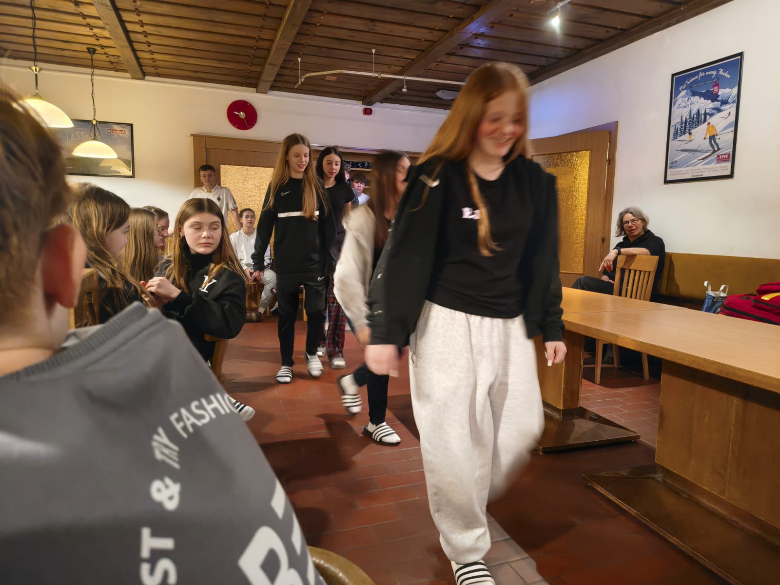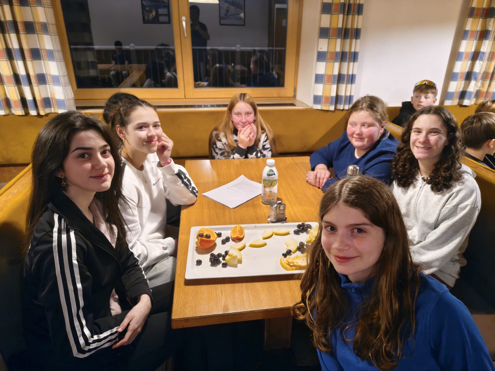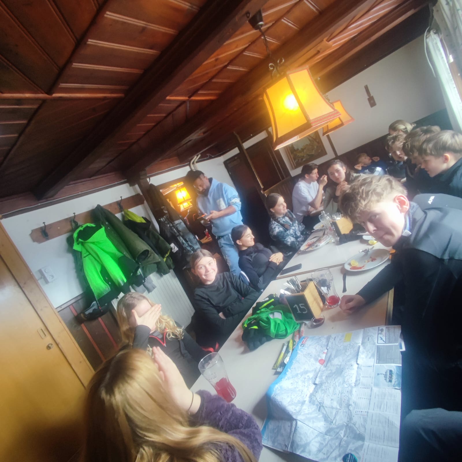 - Heute Morgen sind wir um 7:00 Uhr aufgestanden. Danach sind wir mit der Skibekleidung in den Essenssaal gegangen. Es gab leckeres Frühstück; wir konnten es uns einrichten, wie wir wollten.