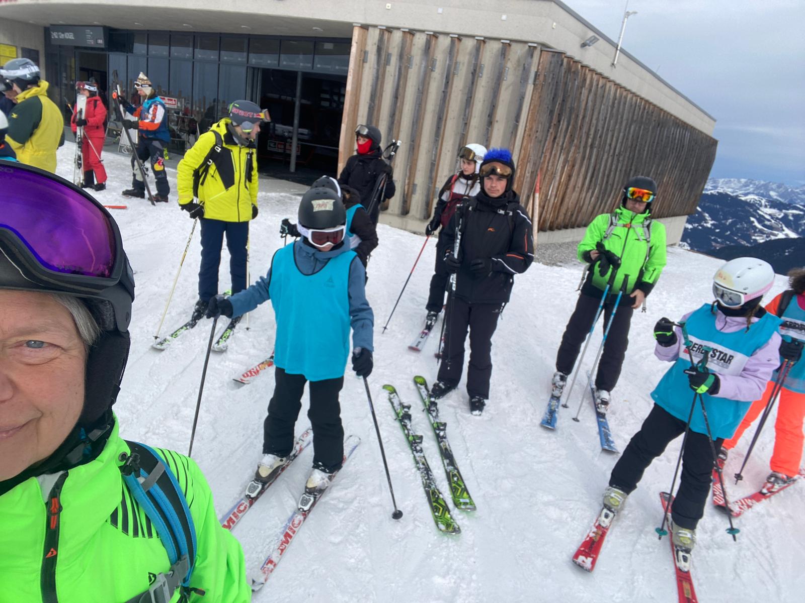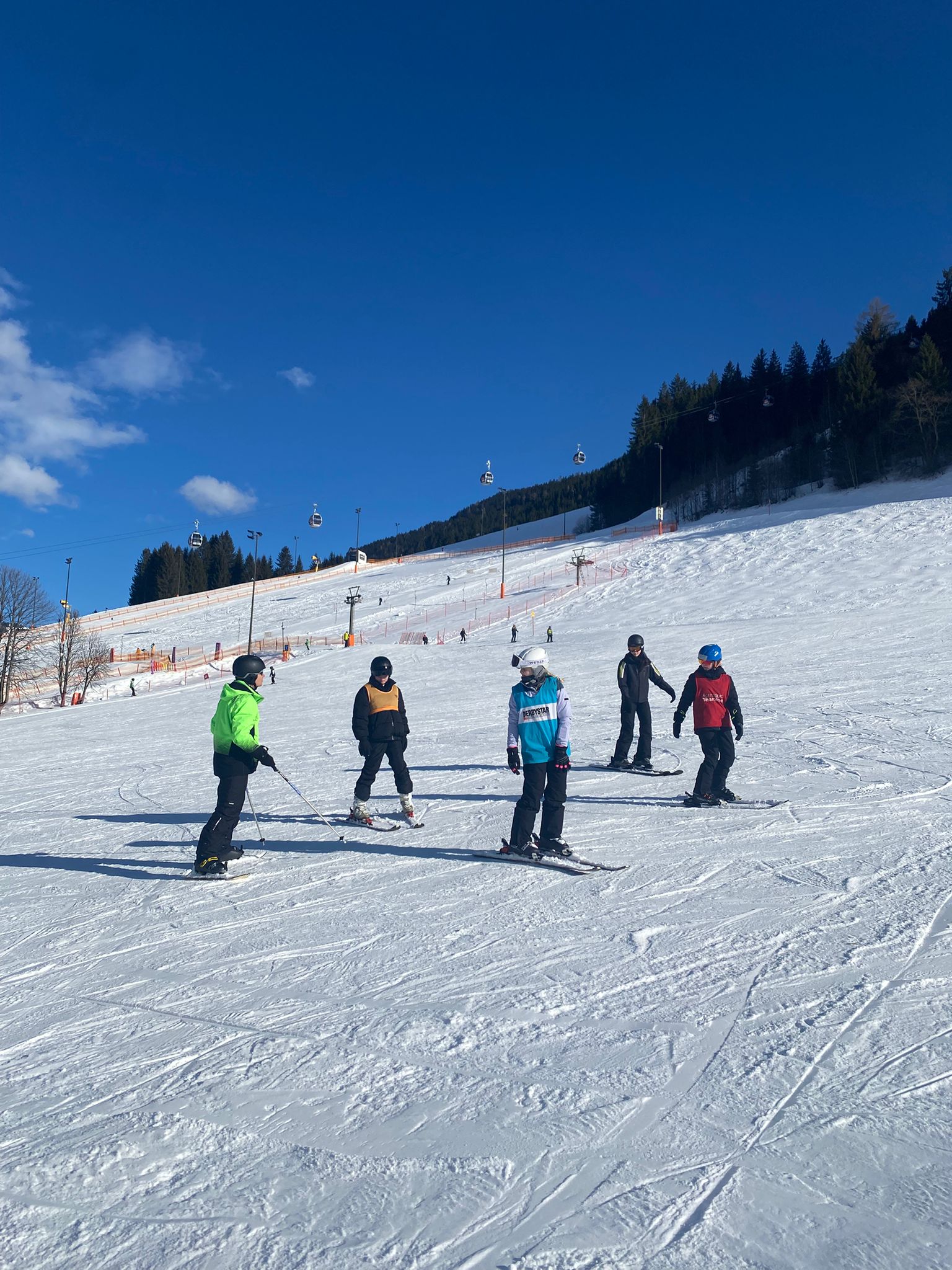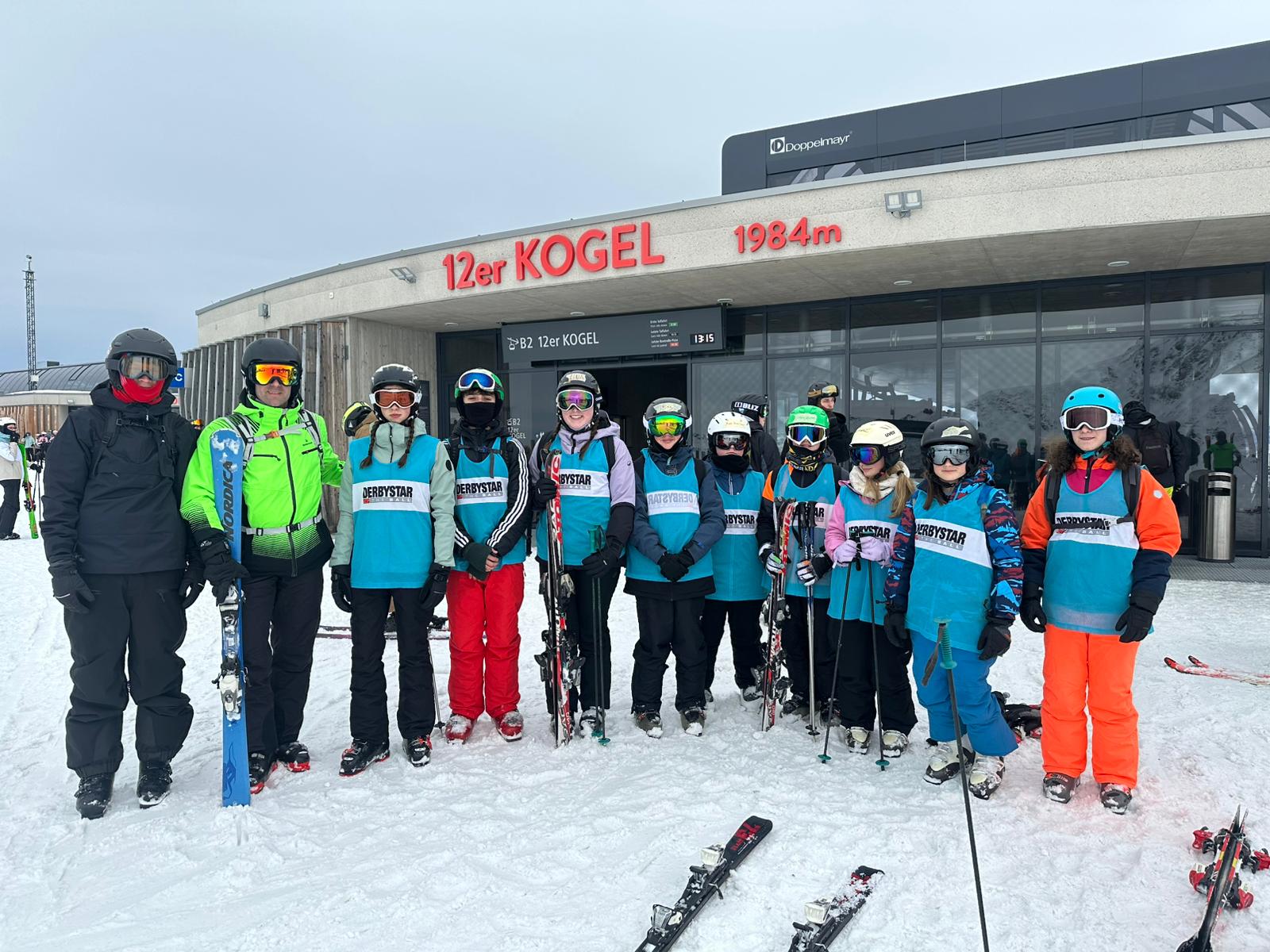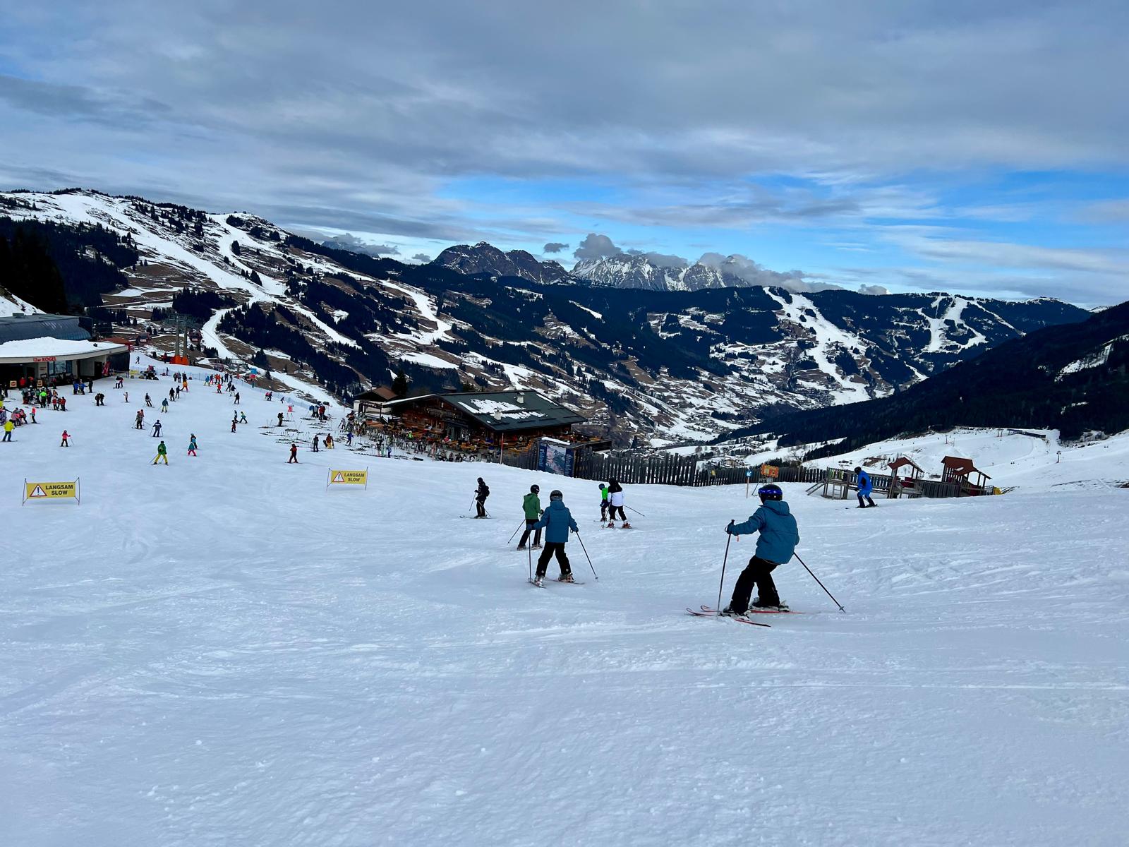 Dann sind wir um 8:05 Uhr in den Skiankleideraum gegangen. Anschließend sind wir zum Bus gelaufen. Nach der schönen Busfahrt sind wir in die 12er Kogel Bahn eingestiegen. Als wir ganz oben am Gipfel angekommen sind, sind wir erstmal die blaue Piste gefahren.