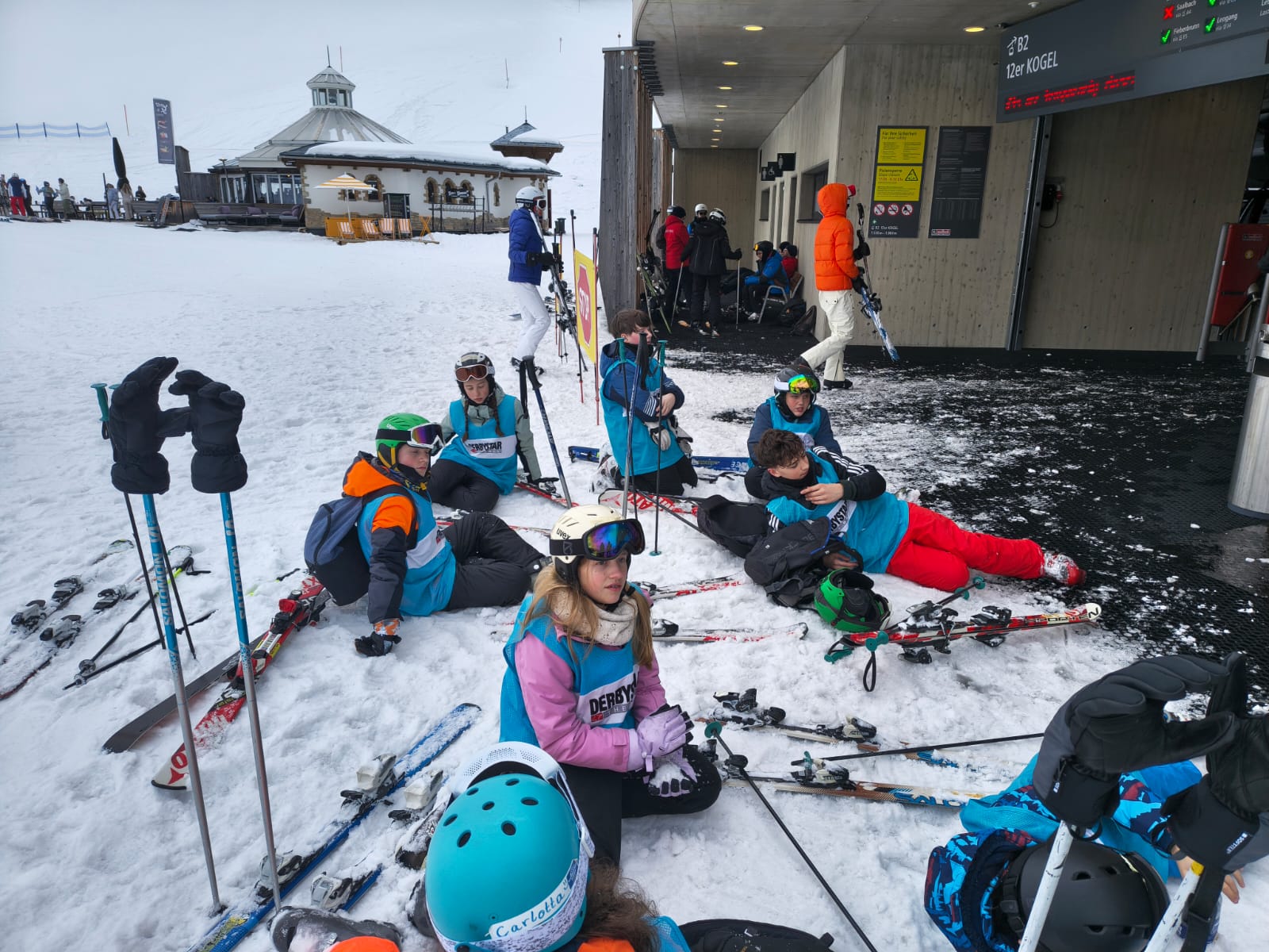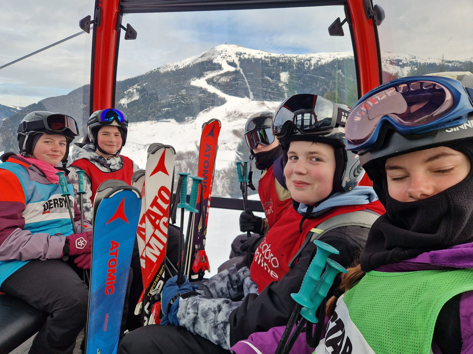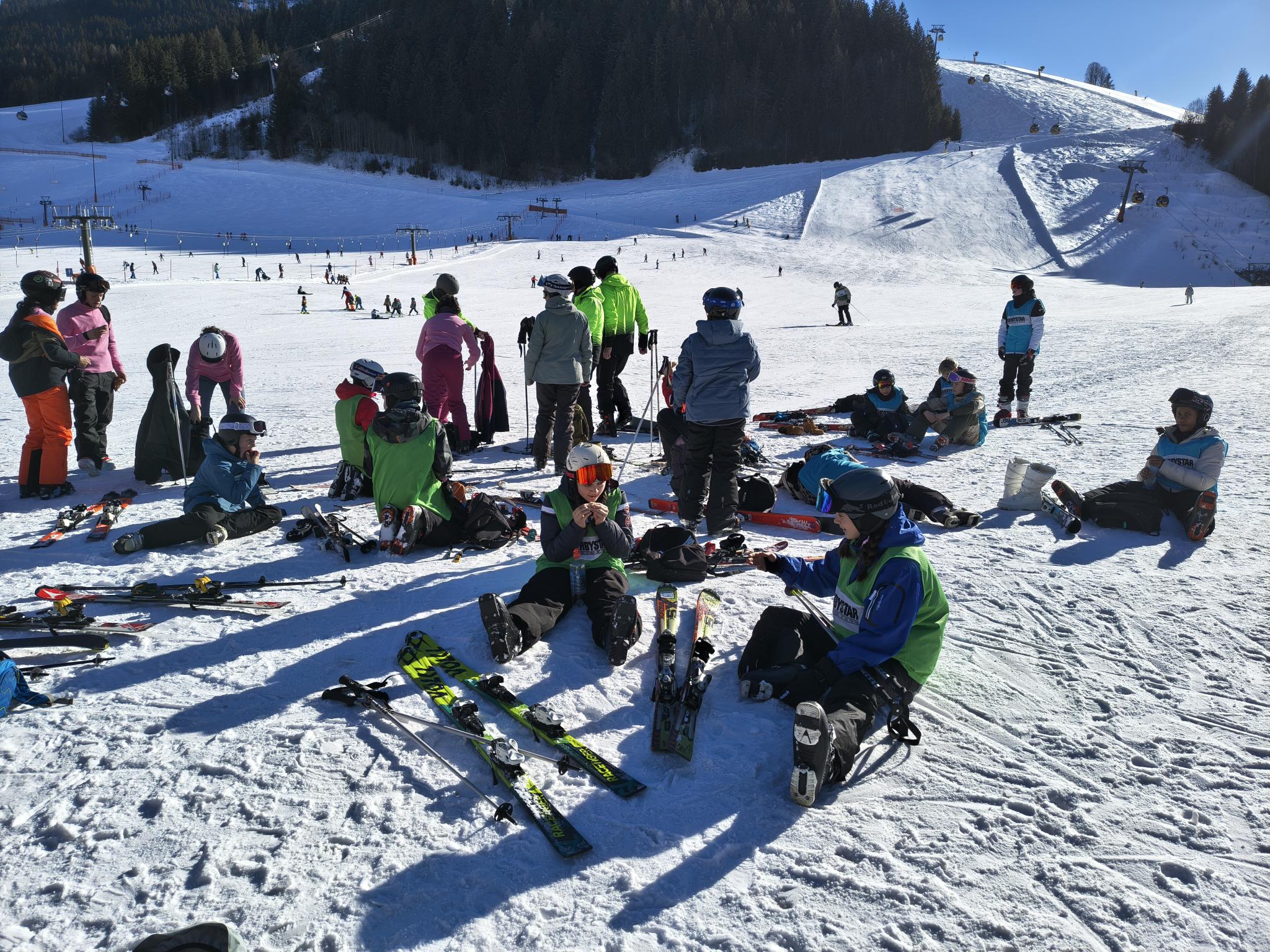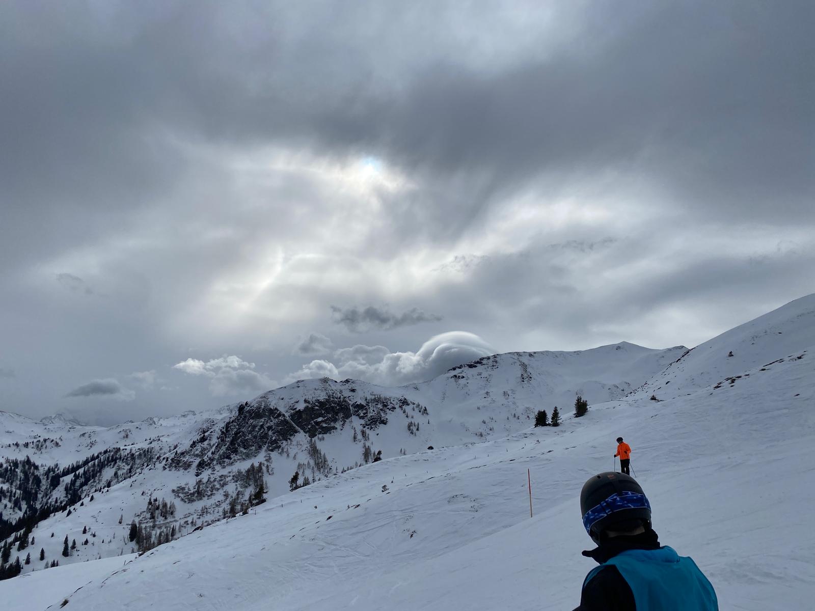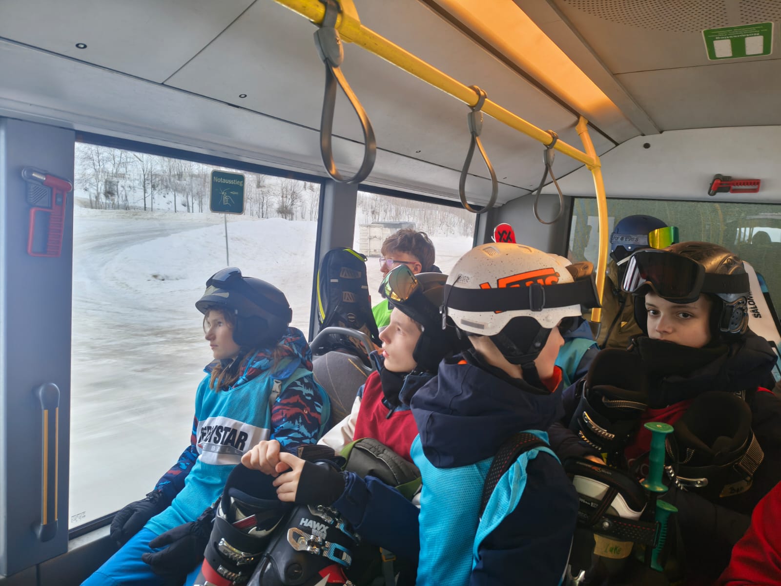 Dann sind wir um 8:05 Uhr in den Skiankleideraum gegangen. Anschließend sind wir zum Bus gelaufen. Nach der schönen Busfahrt sind wir in die 12er Kogel Bahn eingestiegen. Als wir ganz oben am Gipfel angekommen sind, sind wir erstmal die blaue Piste gefahren.