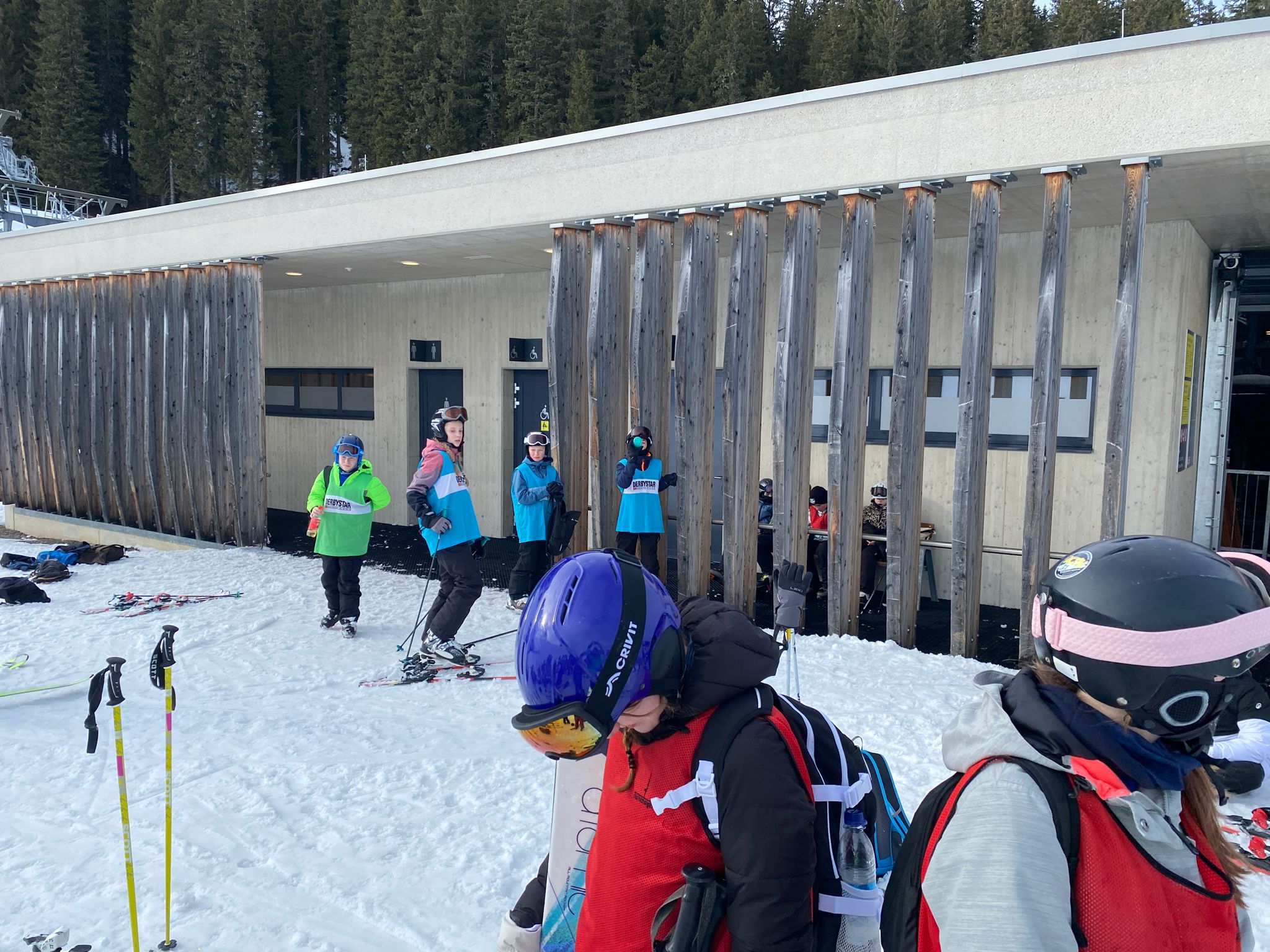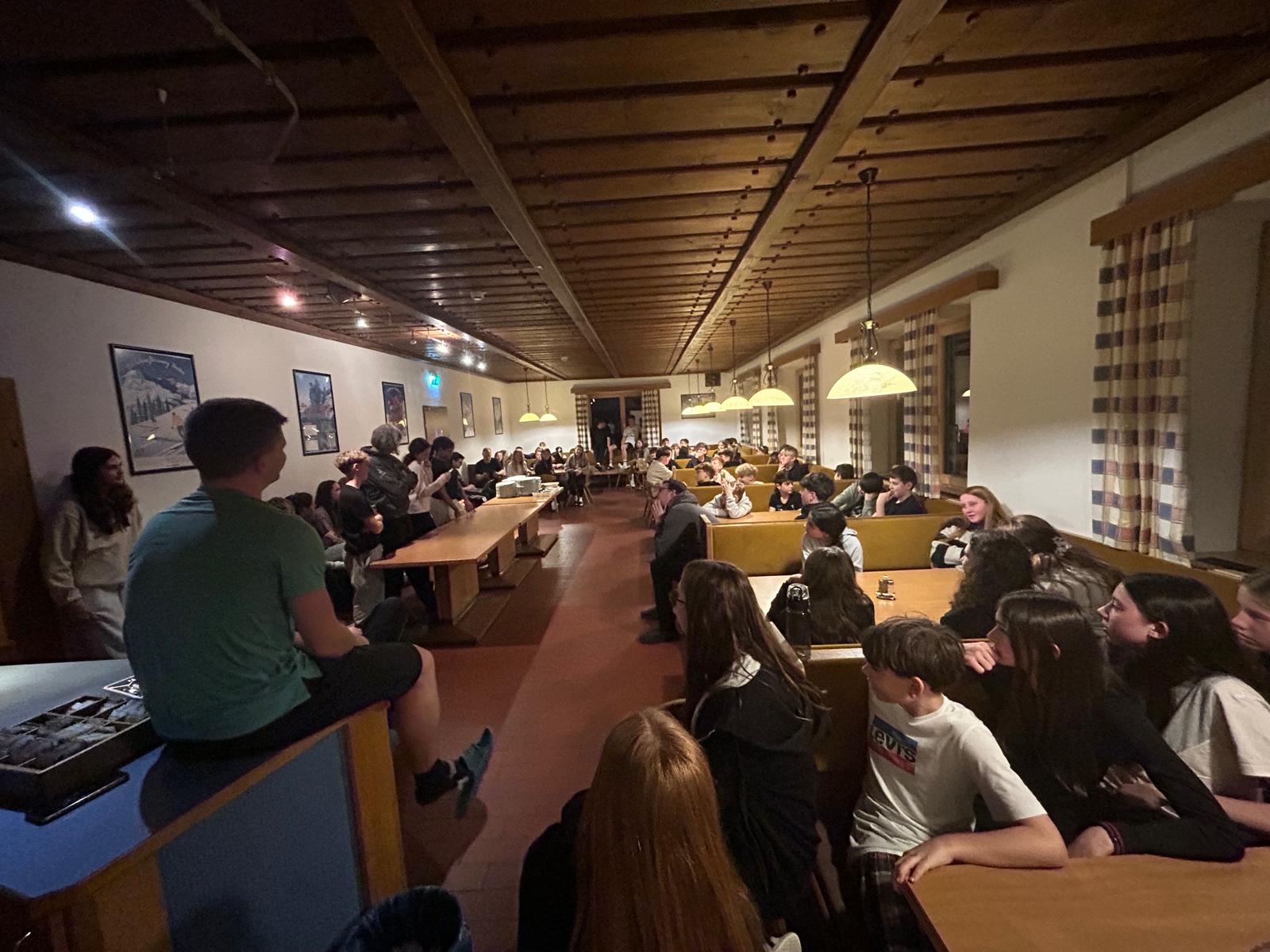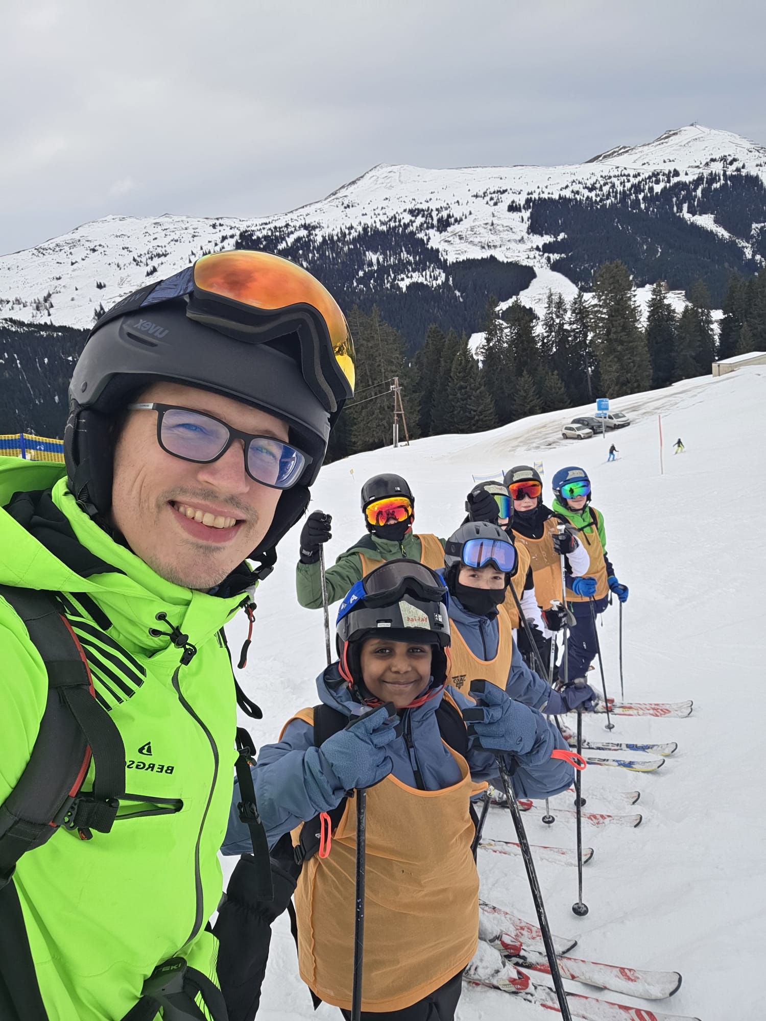 Heute sind wir um 7 Uhr aufgestanden. Nachdem wir uns für das Frühstück fertig gemacht hatten, sind wir direkt hinunter in den Skiraum gegangen. Dort haben wir unsere Skisachen geholt, damit wir auf die Piste konnten. Als wir dort angekommen waren, haben wir uns erst einmal warm gemacht. Irgendwann sind wir mit dem Tellerlift hochgefahren. Oben haben verschiedene Teams unterschiedliche Übungen absolviert. Wir wurden in diese Teams aufgeteilt, da wir für eine einzige Gruppe zu viele Personen waren. Später haben wir eine Pause gemacht, die ungefähr 45 Minuten dauerte. Danach sind wir alle wieder weitergefahren und manche sind auf eine große Piste gefahren und manche nicht, weil sie es sich noch nicht getraut haben. Dann war irgendwann 15.30 Uhr und dann sind wir nach Hause gefahren mit dem Skibus. Dann sind alle Duschen gegangen. Um 19 Uhr gab es Abendessen. Es gab Ratatouille mit Couscous und zum Nachtisch gab es Mango-Joghurt. Am Schluss haben wir einen Spieleabend gemacht.