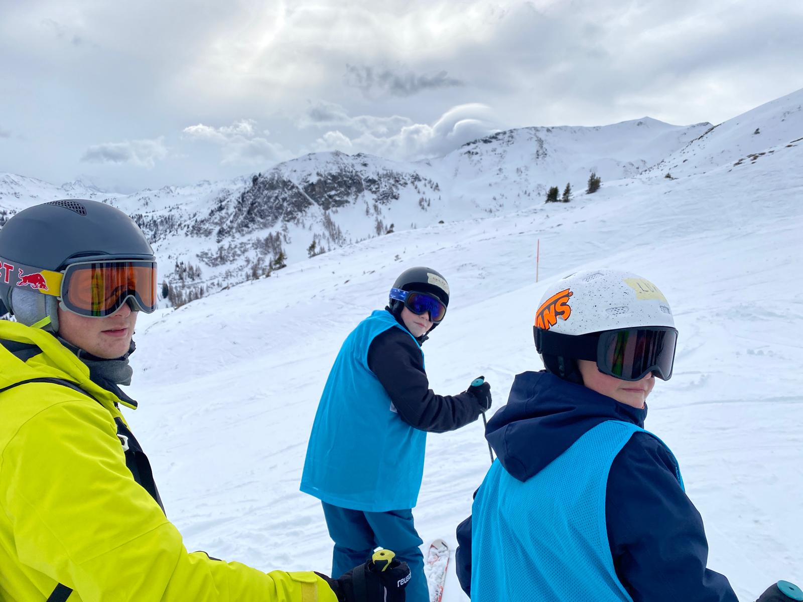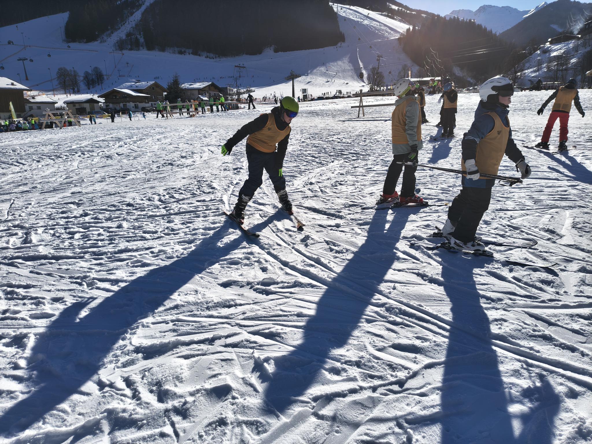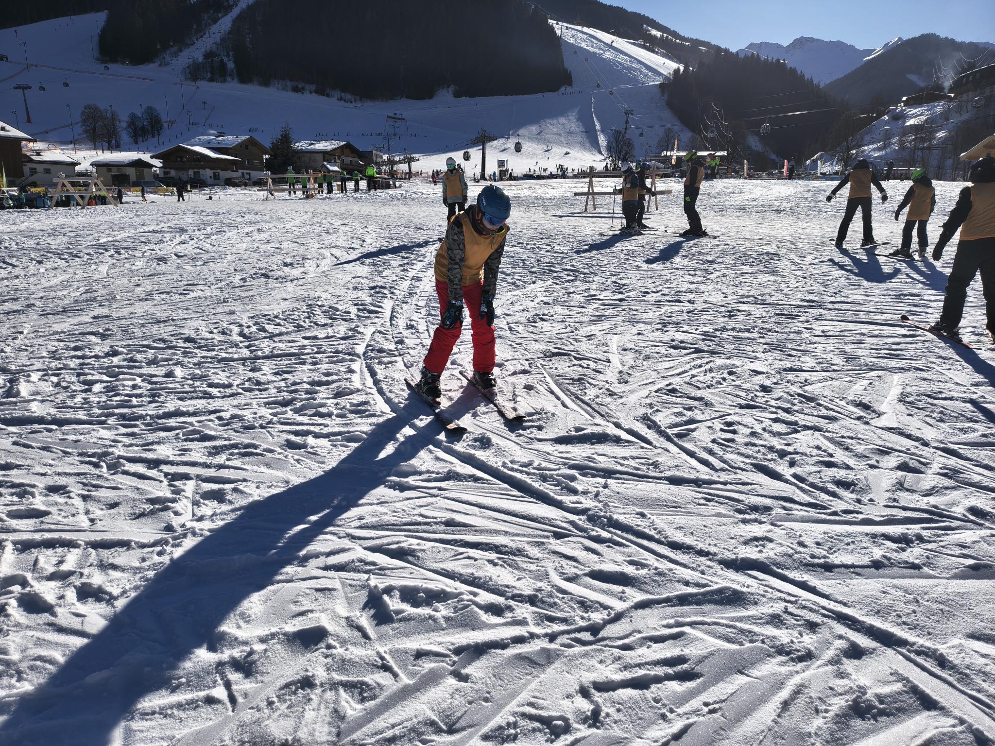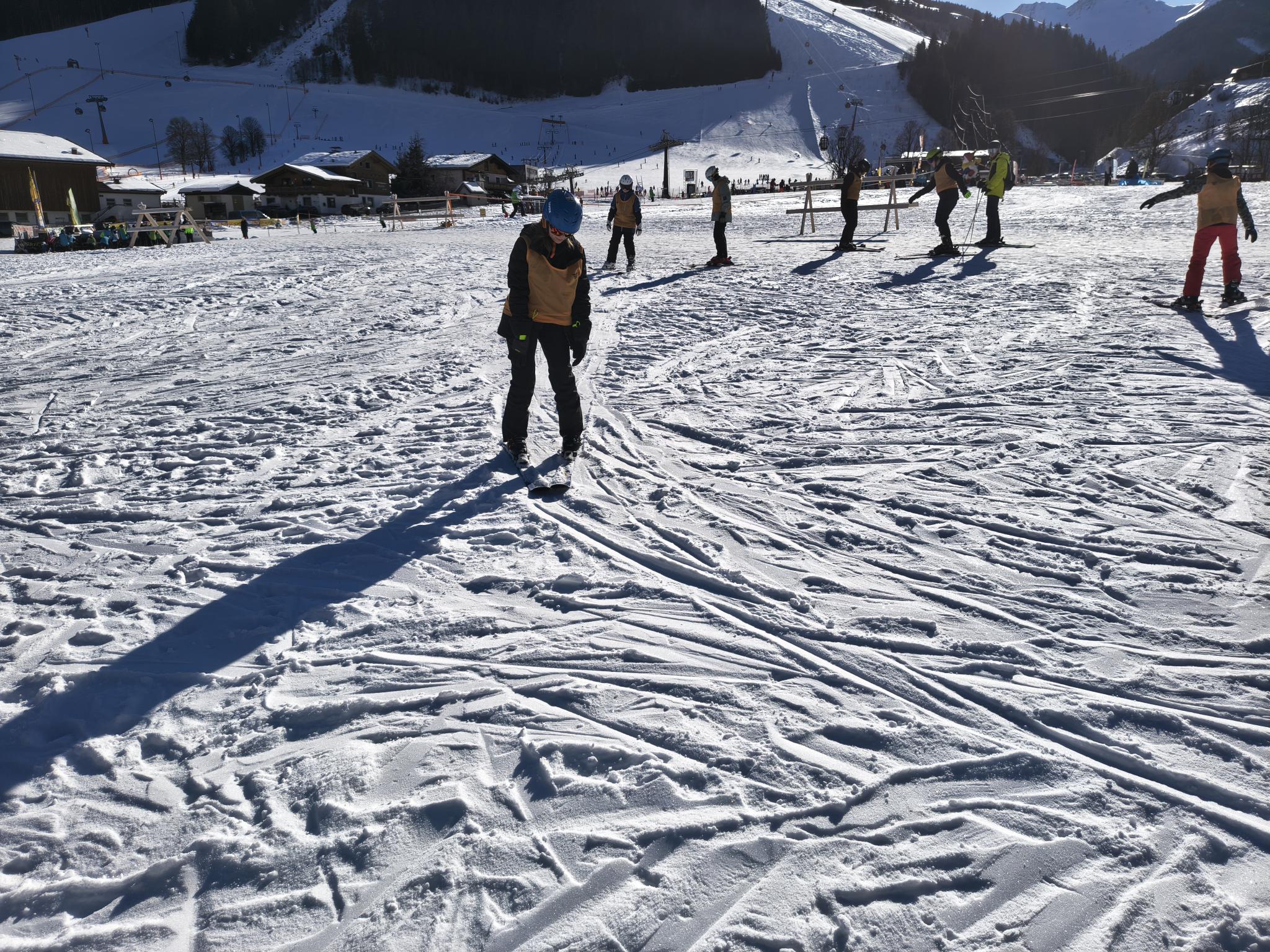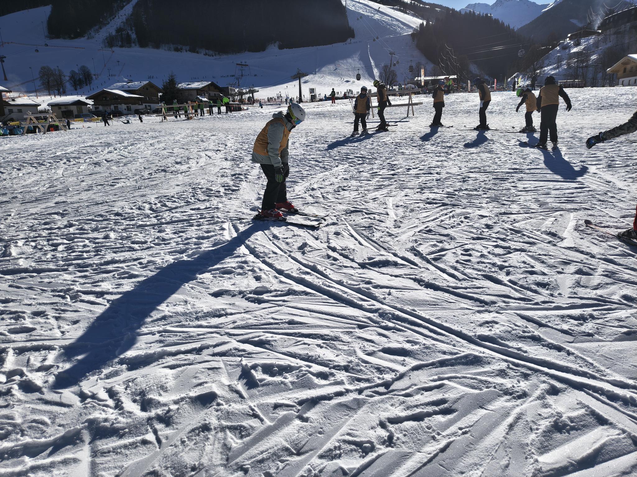 - Heute morgen sind wir gegen 7:00 Uhr aufgestanden. Dann gab es Frühstück um 7:30, das Frühstück ist immer sehr lecker. Danach haben wir uns das Lunchpaket für die Piste eingepackt. Um 8:25 Uhr sind wir mit dem Bus zur Piste gefahren, davor haben wir im Skikeller die Skischuhe geholt. An der Bushaltestelle angekommen sind wir zur Scheune gegangen, wo die Skier drin stehen, die haben wir dann angezogen und mit Frau Schikotanz am Anfängerhügel, sind wir uns warm gefahren. Nach 4 Runden warmfahren sind wir mit der Gruppe von Frau Schikotanz mit dem 12er Express hochgefahren und das Stückchen rote Piste runtergefahren. Nachdem wir runter gefahren sind, sind wir mit der 12er-Kogel-Lift bis ganz hoch auf den Gipfel gefahren. Von dort aus sind wir die blaue Piste runtergebrettert. Nach dem ersten Mal haben wir eine kleine Pause gemacht und die Rucksäcke abgestellt. Danach sind wir die gleiche Piste nochmal gefahren. Nun sind wir eine andere Piste mit einem anderen Lift gefahren. Nachdem wir da unten waren sind wir zu einer Alm gefahren und haben was leckeres gegessen und getrunken. Als alle fertig waren, sind wir noch einmal eine blaue Piste gefahren. Als wir da unten waren, habe ich eine kleine Pause gemacht mit Ben und Giuliano, weil mein Knie wehgetan hat. Dann sind wir drei mit Herrn Knapp runter zum Anfängerhügel gefahren. Dort sind wir noch einige Runden mit dem Tellerlift gefahren. Am Tellerlift hatte Ben keine guten Erfahrungen gemacht, da er einer Snowboarderin beim Fahren zugeguckt hat und zu abgelenkt war, sind seine Skier überkreuz und so ist er aus dem Lift gefallen. Nachdem haben wir unsere Skisachen abgegeben und nach Hause gefahren. Zuhause angekommen dort sind alle Duschen gegangen. Um 19:00 Uhr gab es Essen. Es gab Ingwer-Suppe, Reis und Hähnchen Curry. Es hat ganz OKE geschmeckt. Im Insgesamten war der Tag richtig witzig. Der Ben und der Giuliano fanden es auch sau witzig.