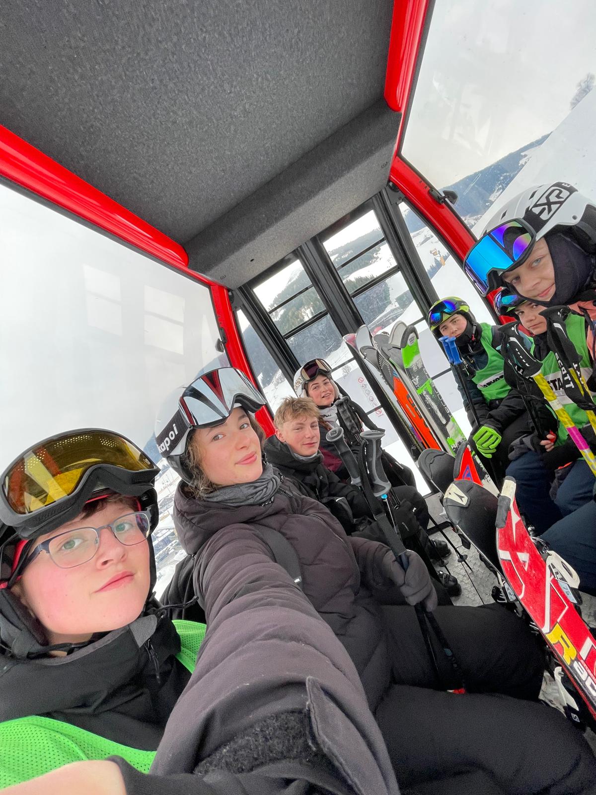 Wir sind danach eine andere blaue Piste und eine rote Piste gefahren. Dann sind wir das erste Mal Sessellift gefahren; es hat sehr viel Spaß gemacht! Es gab da zwar schon bei ein paar Probleme, aber egal – es kam jeder fehlerfrei zur Piste. Danach sind wir noch öfter die Piste herunter gefahren. Es kam jeder ohne Beinbruch herunter. Danach konnten manche nicht mehr. Deswegen fuhren manche mit Herr Knapp und Alex herunter. Dann sind manche mit Herrn Knapp den Anfängerhügel heruntergefahren und die drei Spezialisten schreiben gerade diesen Text und “ja”, weil wir die Piste einfach im Schuss herunter gefahren sind. Nach dem ganzen Gewusel gab es um 19.00 Uhr Essen. Nach dem Essen tragen wir noch die Gedichte, die wir ein Tag zuvor geschrieben haben. Dann haben wir Koffer gepackt und sind schlafen gegangen.