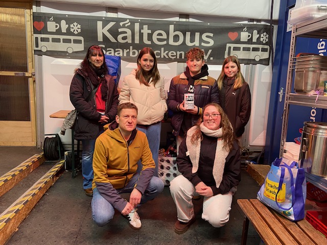 Unter diesem Motto haben die Schülerinnen und Schüler des neuen Profilfachs „Soziale Verantwortung“ der GemS Schaumberg Theley im Dezember vergangenen Jahres Sach- und Geldspenden zugunsten des Kältebus Saarbrücken e.V., der ehrenamtlich in Saarbrücken bedürftigen Menschen hilft, gesammelt. Mit viel Engagement und dank einer großartigen Schulgemeinschaft kamen so neben 285€ auch eine Menge von über 170 5-Minutenterrinen, 116 Packungen Gummibärchen, unzählige Schokoriegel und Bonbons sowie Getränke zusammen. Ein Wahlpflichtkurs von Frau Pitsch schloss sich kurzerhand der Aktion an, verkaufte Pizzabrötchen und spendete den Erlös von 128€ zugunsten des Kältebus e.V..