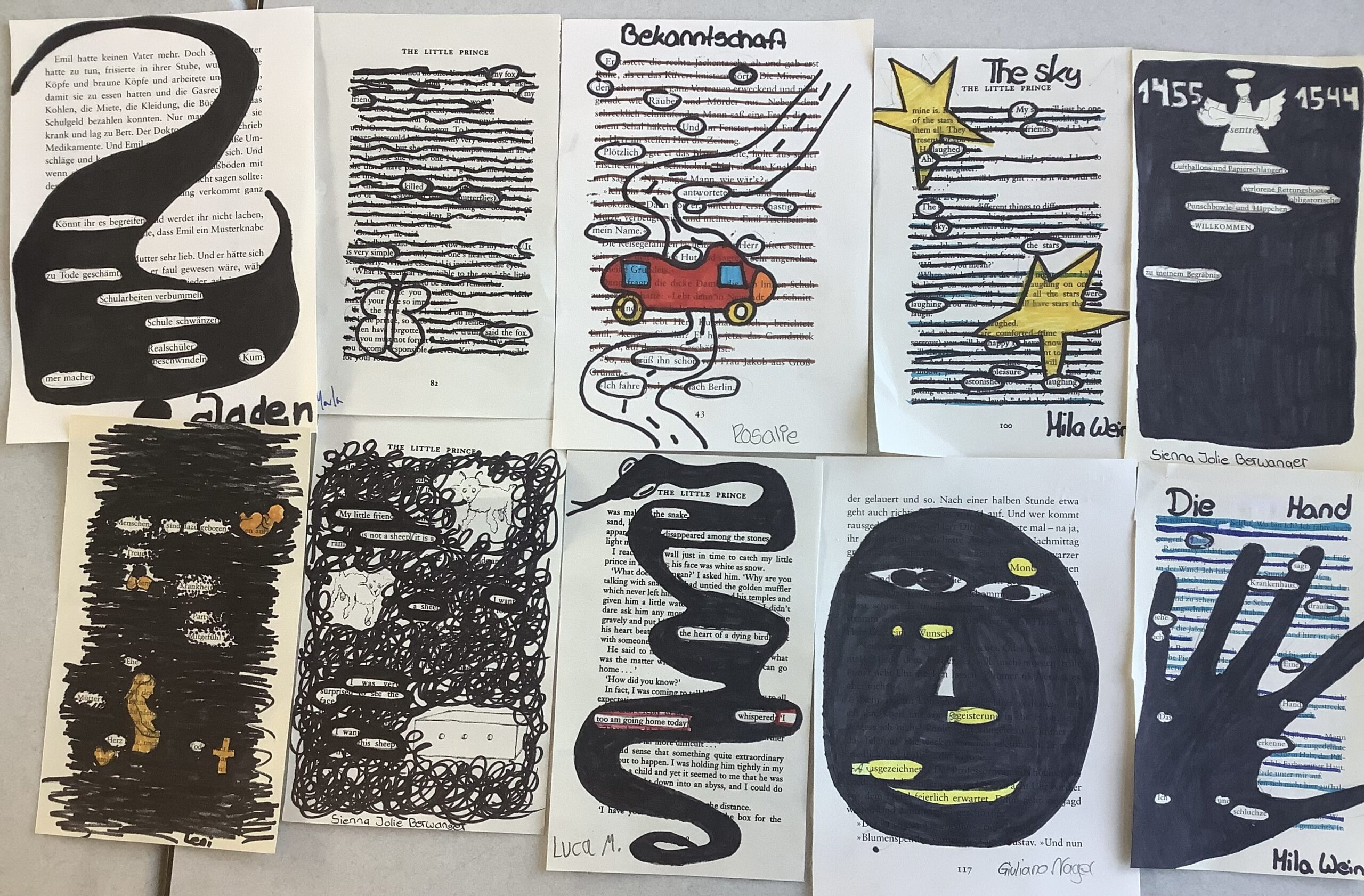 Ganz geheimnisvoll lief die Planung für einen besonderen Tag ab: Die Klassenlehrer der Klasse 6s, Frau Gemmel und Herr Schu, verrieten den Kindern nur, dass sie einen Morgen außerhalb der Schule verbringen würden und Stifte mitnehmen müssten. „Wohin gehen wir?“ und „Was machen wir dort?“ waren die meistgestellten Fragen auf dem Weg zum Bücherbaum am Schaumberg. Erst dort wurde das Geheimnis gelüftet: „Wir kreieren Blackout-Poetry“. Was ist das denn? Man wählt eine Seite aus einem alten Buch und umkreist beliebig viele Wörter, die einem ins Auge springen. Im besten Fall setzen sich die Wörter von oben nach unten gelesen zu einem Gedicht zusammen. Ergeben sie beim ersten Versuch keinen Sinn, fügt man weitere Wörter hinzu oder streicht vorher ausgesuchte wieder weg. Zum Schluss schwärzt man alle Wörter der Buchseite, die nicht für das Gedicht gebraucht wurden. So entstanden zum internationalen „Welttag der Poesie“ künstlerisch gestaltete Gedichte in deutscher und sogar in englischer Sprache. (GM)